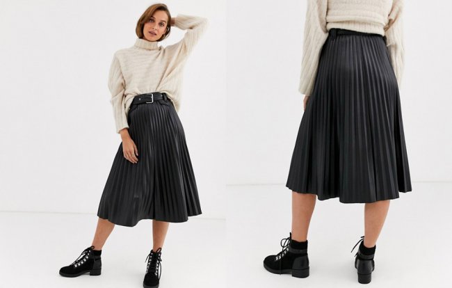 Присмотрись к женственным моделям миди-юбок. Например, в этой сочетается сразу несколько трендов — она сделана из кожи (искусственной, что делает цену доступной), дополнена ремнем, а плиссировка остается актуальной уже около трех лет подряд. Юбка пригодится, если тебе нужно отправиться на вечеринку сразу после офиса и времени переодеться совсем нет.
