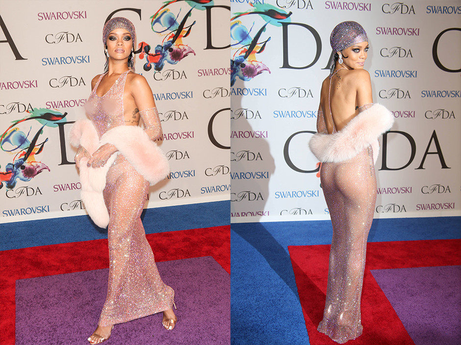 Платье, в котором Рианна появилась на красной дорожке премии CFDA Awards-2014, было предельно простым: полупрозрачная сетка, расшитая 230 тысячами кристаллов Swarovski, обнажающая спину и не слишком скрывающая грудь обладательницы (главный элемент дизайна). Наряд дополняли головная повязка (аллюзия на тюрбан), длинные, выше локтей перчатки из той же стразовой сетки, а также длинное меховое боа нежно-розового оттенка. Наряд а-ля 1930-е годы, словно из фильма «Великий Гэтсби» (он как раз вышел в 2013-м).