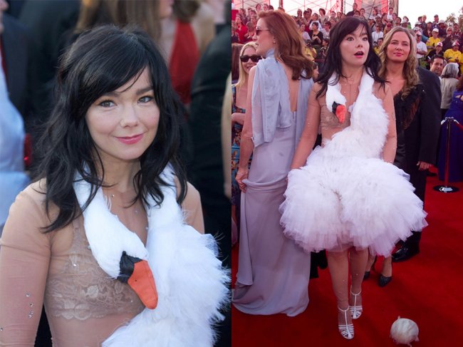 фотографиифотографиифотографииПлатье с лебедем, нежно обвивающим шею своей обладательницы, придумал малоизвестный (до Оскара-2001) македонский модельер Марьян Пежоски. После выхода Бьорк на красную дорожку (а потом и фото в том же платье для обложки альбома Vespertine и выступлений в нем на концертах) о Пежоски стали писать модные журналы и не слишком многочисленные тогда интернет-сайты. Дизайнер основал собственный бренд Kokon To Zai и сделал хорошую карьеру в фэшн-бизнесе.