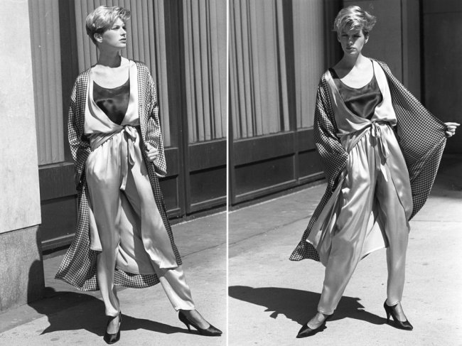 Показ Michael Kors в Нью-Йорке, 1984 год. Rexfeatures.comБританские портные с Сэвил Роу, внимательные к пожеланиям своих заказчиков, быстро освоили новый предмет домашнего гардероба и стали шить вернувшимся из индийских колоний отставникам и всем прочим желающим пижамы по мерке и на европейский лад. У пижамной куртки появился английский воротник с лацканами, карманы (в том числе — позже — и нагрудный), контрастный кант по обшлагам, бортам и подолу, вышитая монограмма и прочие атрибуты респектабельного портновского искусства метрополии.