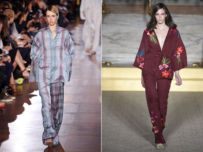 Показы Stella McCartney и Matthew Williamson. Rexfeatures.comПоклонницами «расслабленного шика» стали Джессика Альба, Рианна, Джиджи Хадид, Сирша Ронан, Зендая и другие модницы. Пижамы шили самые разные: однотонные и в полоску, с принтом пейсли («турецкий огурец»), polka dot («в горошек»), с графичными абстрактными рисунками или романтичными цветочками. Особенно забавно смотрелись городские пижамы с рисунками, традиционными для детской: слониками, мишками, пирожными и тому подобными «кавайными» принтами. Их надевали с высокими каблуками — не в пример palazzo pajama 1960-х, к которым полагались балетки и слиперы.