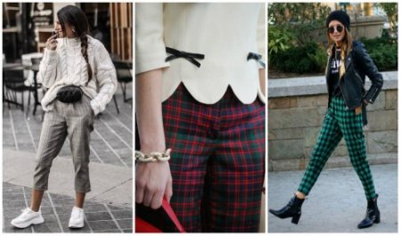 Самые популярные модели в классической красной клетке, но зеленые брюки также не отступают. Если вы надели брюки в таком заметном принте, лучше всего выбрать одноцветную блузку — сделайте ставку на классическую модель в черном или белом цвете. В обуви вы можете выбирать между ботинками с грубой подошвой и грейфером или остановиться на модели с высоким, толстым каблуком.