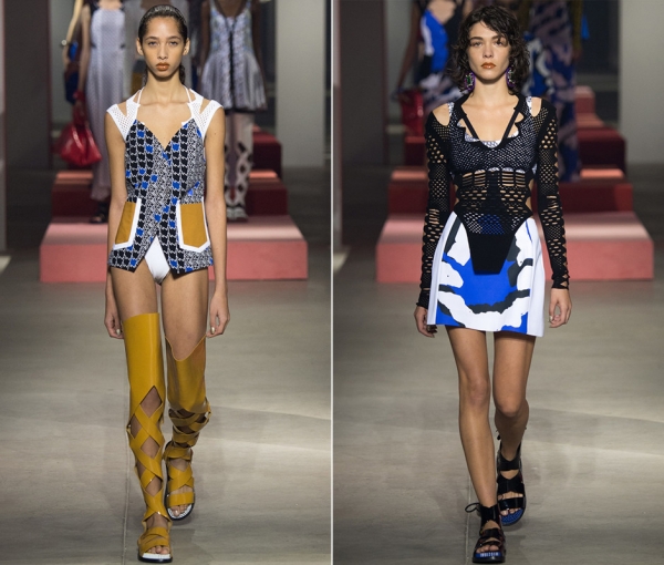 Обувь в новой коллекции Kenzo оказалась чуть ли не важнее самой одежды. Креативные директоры Умберто Леон и Кэрол Лим представили в Париже незабываемые кожаные босоножки — гладиаторские сапоги на небольшой платформе. Они есть в белом, черном и горчичном варианте. Сочетание насыщенного горчичного, белого, серого и голубого наравне с яркими геометрическими принтами стали основными трендами сезона весна-лето 2016 в стиле Kenzo. Также внимание к себе привлекла новая провокационная манера носить боди — в расстегнутом виде поверх мини-юбки или брюк.