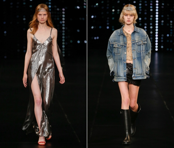 Новую коллекцию Saint Laurent демонстрировали рейв-принцессы. На голове — диадема, на ногах — одноцветные резиновые сапоги. Креативный директор французской марки Эди Слиман не скрывал, что искал вдохновение в 1990-х и нашел его в стиле самых известных бунтарок той эпохи — Кортни Лав и Кейт Мосс. Из гардероба вдовы Курта Кобейна модельер «позаимствовал» широкие потертые джинсовые куртки, свитера и шелковые топы, а резиновые сапоги и платья-комбинации — у супермодели. Получилось смело и атмосферно: в стиле журнальных тогдашней светской тусовки.
