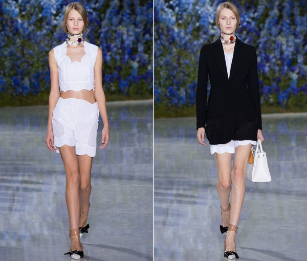 «Спокойной и прекрасной, нежной и романтичной» назвал новую коллекцию Dior сам креативный директор французской марки Раф Симонс. Показ проходил в шатре, драпированном живыми цветами — фиолетовыми дельфиниумами. Модельер признался, что вдохновлялся известным австралийским фильмом «Пикник у Висячей скалы». По сюжету, в 1900 году ученицы школы для девочек, все одетые в светлые платья с корсетами по моде Викторианской эпохи, отправляются на прогулку к Висячей скале, три из них таинственным образом пропадают. Сохраняя настроение фильма, Симонс представил белоснежные кроп-топы, которые лучше всего смотрятся с высокими шортами, немного напоминающими панталоны из прошлого, а также эффектную белую юбку с фигурными краями, укороченную впереди и удлиненную сзади. Важная деталь — шелковые платки на шеях моделей.