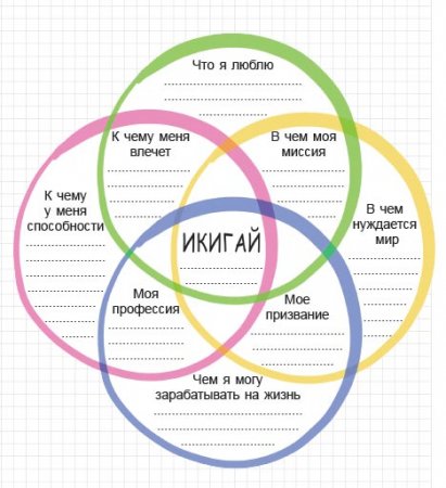 Как узнать, какая жизнь вам подходит больше всего? Для этого надо ответить на 4 вопроса икигая, чтобы открыть свои пристрастия, свою миссию, свою профессию и свое призвание. "Что я люблю" + "К чему у меня способности" + "Чем я могу зарабатывать на жизнь" + "В чем нуждается мир" = икигай.