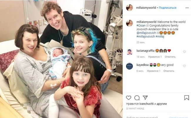 Сразу после родов в палату к Милле пришла вся ее семья: муж, режиссер Пол Андерсон и две старших дочери - 12-летняя Эва и 4-летняя Дэшиел.