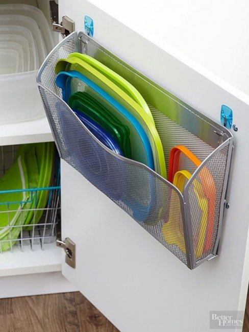 Разделочные доски отлично будут храниться не на столе, загромождая пространство, а в ячейке на двери. Также можно разместить и крышки от пластиковых контейнеров.