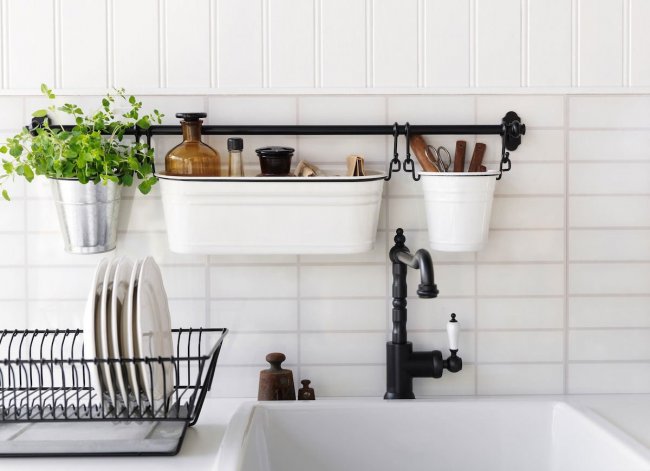 Если возле раковины на кухне слишком мало места, сделайте дополнительную полку над ней при помощи рейлинга и обычных ведерок или садовых горшков, выкрашенных в цвет кухни.