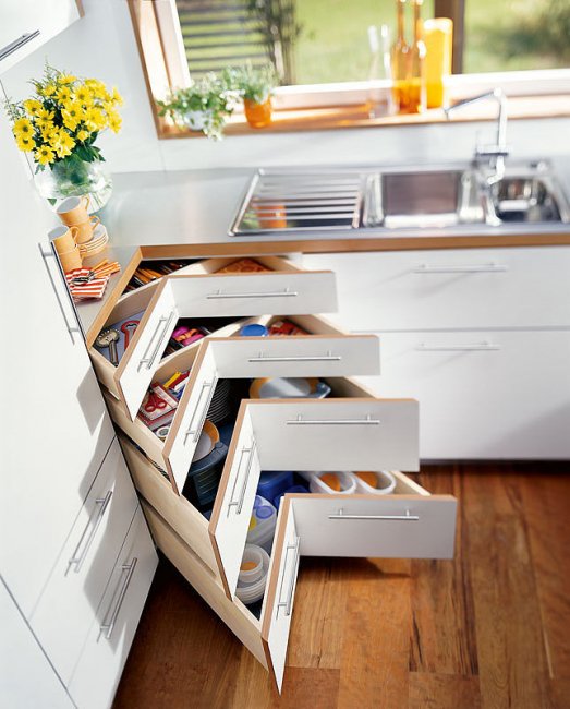 Грамотное использование даже самых узких и непригодных мест, превратит вашу кухню в самое организованое пространство, где все всегда под рукой.