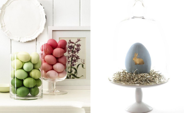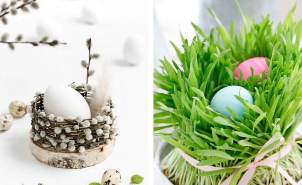 Не обязательно использовать обычные плетеные из лозы корзинки для яиц, чтобы украсить ими дом к Пасхе. Замените их сплетенными собственноручно подставочками из вербы, пучком травы (можно купить в зоомагазине), прозрачной вазой или стеклянным колоколом.