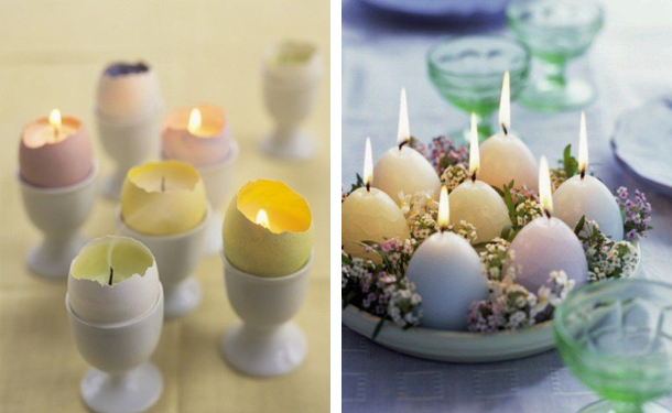 Можно купить свечи в виде яиц, а можно залить парафином пустые скорлупки от яиц - получится необычное и стильное пасхальное украшение.