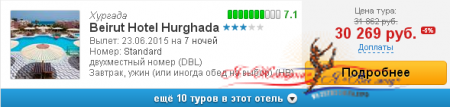 Чтобы поселиться с 23 июня в более презентабельном отеле, туристы могут заказать тур в «Beirut Hotel Hurghada» (рейтнг 7.1). Это также трехзвездочная гостиница на первой пляжной линии, в 4 километрах от центра Хургады. Путевка с заселением в двухместные номера Standard (DBL) и питанием HB обойдется в 30 269 рублей. На территории комплекса и пляже имеется масса средств для организации активного досуга.