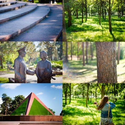 Парку не хватает немного элегантности и эстетики. Но есть в нем другая сторона. Простая и душевная. Широкие аллеи, достаточно тени, много развлечений для детей. Озеро, катамараны, веревочный парк, аттракционы и колесо обозрения. На главной аллее возвышается напоминающий пирамиду Курган бессмертия. Территория вокруг кургана облагорожена, а скейтеры и роллеры используют под катание спуски мемориала. В парке много военных монументов и памятников. Еще одна приятная особенность — сосновый лесок. Запах хвои там просто невероятный.