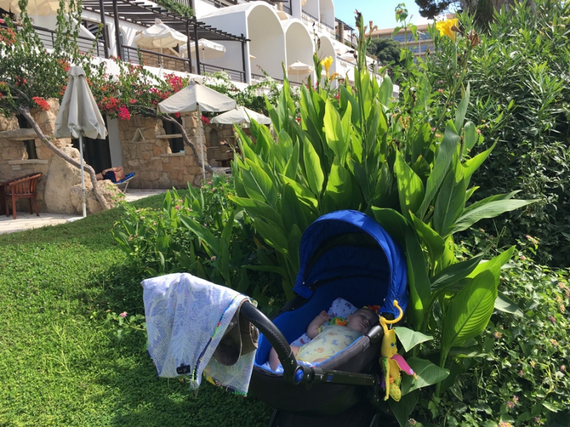 Устав от внимания, Тимоша нырнул в коляску и отправился спать под куст. На улице светит яркое солнышко, а под кустом прохладно, так хорошо для малыша. Вечером мы проснулись и пошли на ужин, познакомились с аниматорами, стали с ними танцевать. Тимоша изображал диснеевских героев, фотографируясь со всеми желающими.