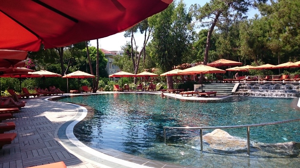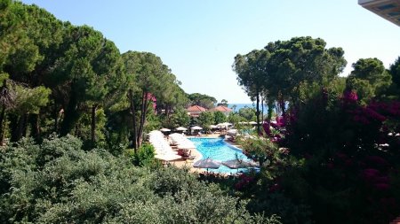 Бассейны, расположенные на территории отеля, имеют причудливые формы и очень живописно вписаны в ландшафт. Приятную тень у бассейнов создают сосны с раскидистыми кронами.