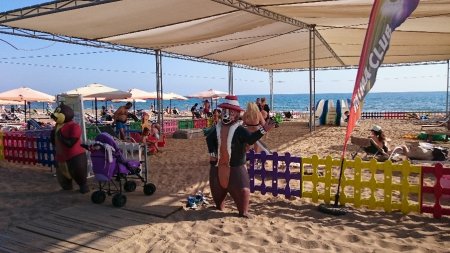 На пляже под большим тентом — еще одна детская площадка, но здесь дети играют уже под присмотром родителей.