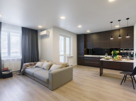 Весь интерьер квартиры выполнен в нейтральных тонах. Новая гостиная Кожевниковой состоит из белого, бежевого, коричневого и черного цветов. Можно обратить внимание на совмещенную с ней кухню, которая выглядит очень функциональной. В таком количестве шкафчиков и ящиков точно можно уместить все необходимые для готовки предметы. К тому же, материал выглядит дорого и наверняка сможет радовать артистку долгие годы.