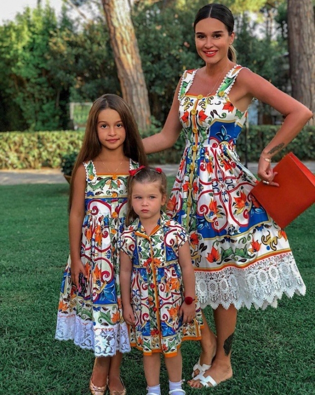 Маленькие модницы, Тея и Маруся, гордо вышагивали в красочных платьях из последней коллекции Dolce & Gabbana, равно как и сопровождающая их Ксения Бородина. Причем Маруся и Ксения были в совершенно одинаковых платьях, в то время как наряд Теоны представлял собой детский аналог, выполненный из той же ткани.
