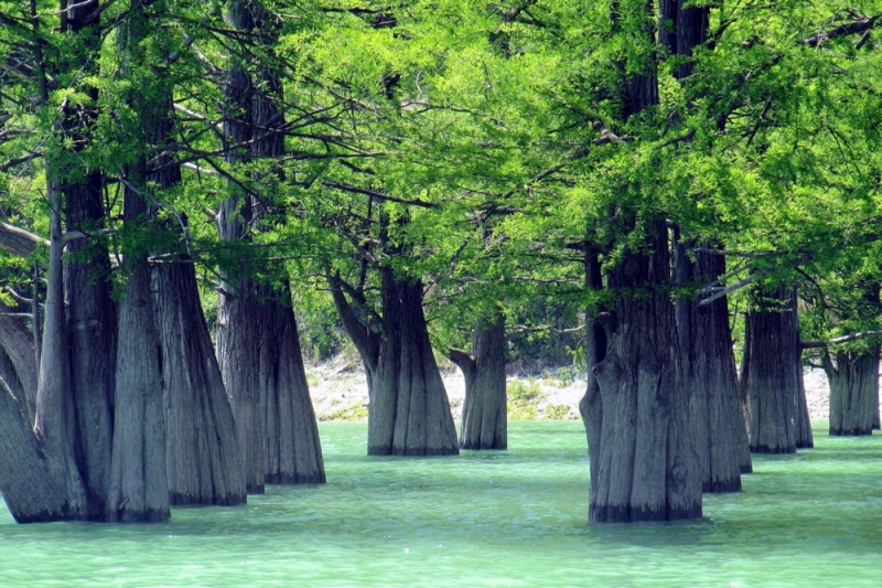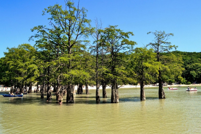 В конце этого лета кипарисы еще были зелеными. Такими они останутся вплоть до конца октября. В августе уровень воды понизился так, что к кипарисовой роще можно было подойти и пройтись между деревьями. Вещества, выделяемые кипарисами, убивают микробы и укрепляют иммунитет.