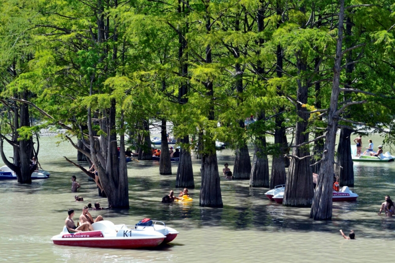Летом озеро полноводное, а осенью мелеет, так что становятся видны корни кипарисов.