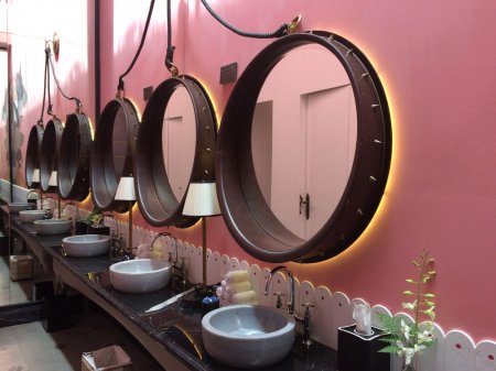 Туалет с собачьими следами на полу и ошейниками-зеркалами