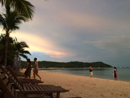 Заход в море пологий, долго брести по дну сможет даже ребенок — или китаец. Они, как выяснилось, почти не умеют плавать: купаются, зайдя в воду по колено, в спасательных жилетах. На пляже также можно взять SUP-доску и безмятежно поскользить по глади моря.