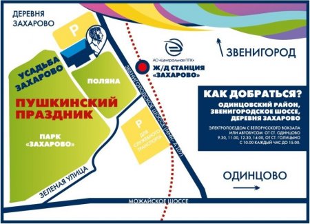 Парк Захарово - популярное и любимое местом отдыха для местных жителей и многочисленных туристов. На территории парка расположена Русская деревня, Поляна сказок, Малая поляна с летней эстрадой и танцевальной площадкой, Аллея Славы, Яблоневый сад, спортивная и детская площадка. Для посетителей парка ведётся аудио вещание сказок и лирики А.С. Пушкина, свои двери открывает «Театр Сказок». И это не всё. В парке проводятся праздники, мастер- классы, фестивали, концерты, конкурсы и многое другое.Вход свободный, начало в 11 часов.Схема проезда: