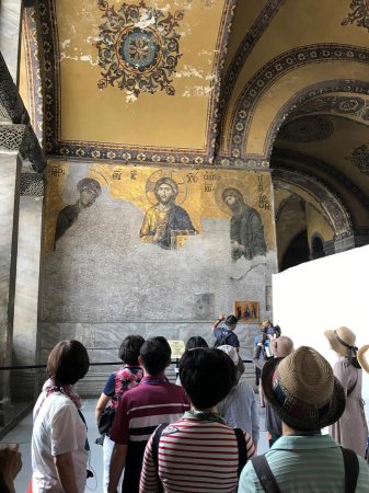 На втором этаже, куда ведёт наклонная рампа вместо привычной лестницы — золотые византийские мозаики, что были спрятаны под штукатуркой мусульманского периода. Они восстановлены не до конца, но достаточно, чтобы произвести неизгладимое впечатление.