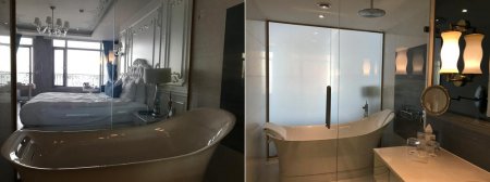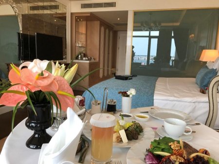 Маленьким детям предоставят детские кроватки и стульчики, а дети постарше — да и взрослые! — будут зачарованы ванной комнатой. Косметика Hermes c горьковатым ароматом зеленого апельсина, изящный букет цветов у раковины, очень удобно объединенные в одном пространстве ванна и душ — это приятно, да, но еще тут есть волшебная стена, разделяющая комнату и спальню. Входишь — стена прозрачная, видно весь номер и синий-пресиний Босфор — можно принять ванну с видом. Хочется уединения — нажимаешь обычный выключатель: и стекло мгновенно мутнеет, становясь молочно-белым и непрозрачным.