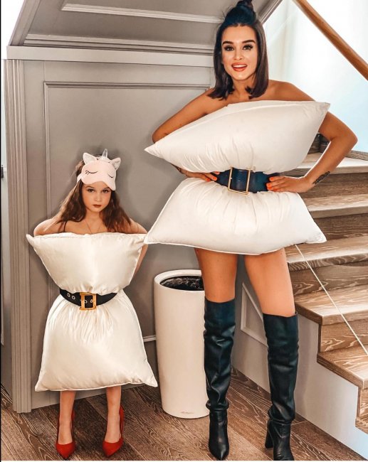 Усложнила условия челленджа и Аделина Сотникова: она смастерила платье из двух черно-белых подушек и заявила, что этот наряд ей очень идет.