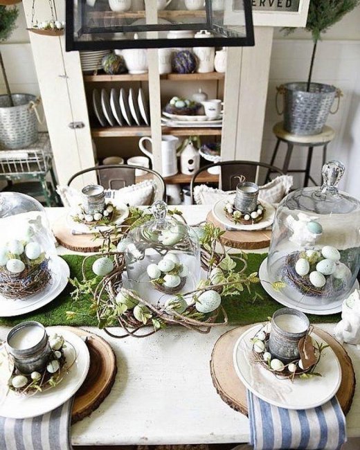 • Сервировка пасхального стола «под старину» удивит гостей винтажными птичками, кувшинами, словно вылепленными вручную, немного «потертой» посудой.
