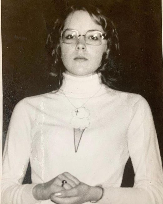 В кадре юная Шэрон позирует облаченная в светлый свитер с высоким горлом. Примечательно, что на груди девушки можно разглядеть милое изображение мороженого в вафельном рожке и скромный крестик на тонкой цепочке. Темные кудрявые волосы, минимум макияжа и очки с довольно массивными стеклами.