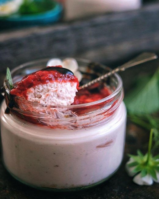 Автор фото и рецепта Инна Щербакова: instagram.com/inn5775/ Ингредиенты (на 4 банки по 150-180 гр): 100 гр клубничного пюре200 гр маскарпоне130 гр сливочного творожного сыра50 гр сахара100 гр сливок 33% жирности8 гр листового желатина150 гр размятой клубники20 гр сахара1 ст.л. бальзамического уксуса1 ч.л. кукурузного крахмала1 ст.л. водыСвежесмолотый черный перец5 шт печенья типа «Юбилейное» Процесс приготовления: 1. Желатин замочить в холодной воде на 3-5 минут. Клубничное пюре, маскарпоне, сыр и сахар смешать в сотейнике. Нагреть, помешивая, до 40 градусов. Добавить отжатый желатин, размешать и охладить. Сливки взбить до крепких пиков. Смешать обе массы.2. Клубнику размолоть в блендере с насадкой нож. Смешать с сахаром и довести до кипения. Крахмал развести с водой, вылить в клубнику, дать закипеть. Добавить бальзамический уксус и размолотый перец, размешать и охладить.3. Печенье размолоть в крошку. Разложить по банкам. Сверху выложить сырный крем, убрать в холодильник. Как только крем застынет, выложить сверху бальзамическую клубнику и снова убрать в холодильник минимум на 3 часа.