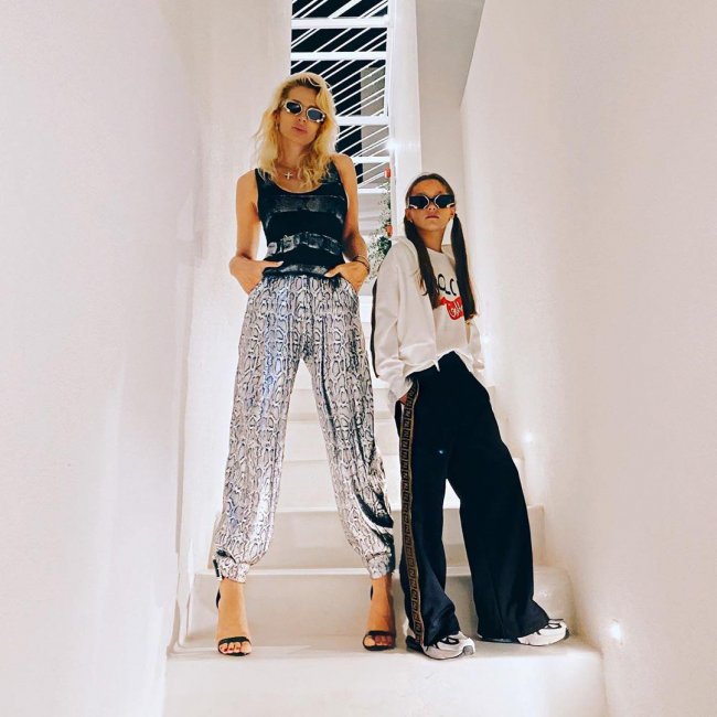На этот раз Евангелина и Светлана устроили настоящую фотосессию в своем доме. Они позировали стоя и сидя на лестнице в стильных необычных нарядах и солнечных очках. Певица выбрала для снимков с дочерью легкие широкие брюки и темный топ, дополнив образ босоножкам на каблуке, а Евангелина предпочла наряд в спортивном стиле: брюки и светлый джемпер.