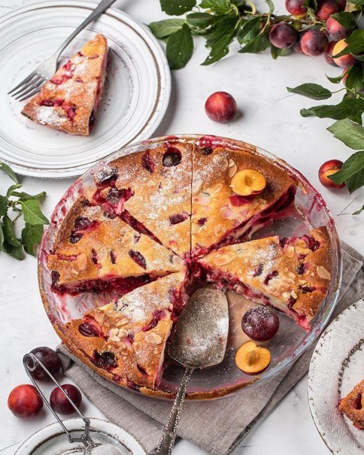 Ингредиенты:700 г алычи без косточки и плодоножки50 г растопленного сливочного масла4 яица (250 г)250 г сливки 33-35%100 г муки (можно 1:1 пшеничную и миндальную)щепотка соли100 г сахараваниль в любом видесахарная пудра для подачиспеции любимыеминдальные лепесткисахар и сливочное масло для обсыпки формы