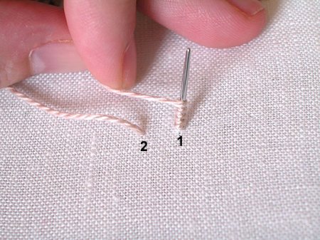 Выведите нить на лицевую сторону в точке 1 и проведите на изнанку в точке 2, образовав довольно длинную петлю (эту нить обвивают вокруг иглы).