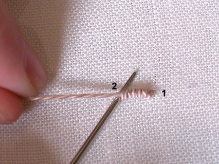 Выведите кончик иглы в точке 1 и обмотайте вокруг него нить петли, 5—8 раз. Придерживая витки свободной рукой, протяните через них иглу.