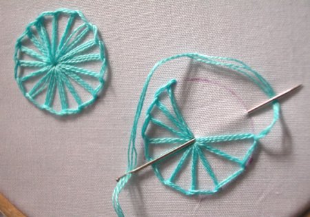 Петельные колёса вышиваются против часовой стрелки. Нить по внешнему краю образует витую границу.Выведите нить на лицевую сторону на краю круга, проведите на изнаночную сторону через центр в точке 2 и выведите на краю, близко от предыдущего стежка (точка 1). Нить должна располагаться ПОД иглой, как показано на рисунке (точка 3). Слегка натяните нитку.