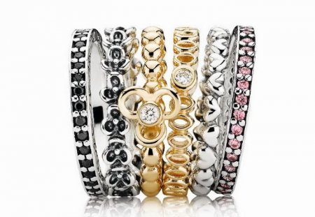 Изменить облик браслета совсем не сложно. Достаточно заменить одни шармы другими, что-то убрать, что-то добавить, а то и просто поменять бусины и подвески местами. С кольцами дело обстоит сложнее. Но дизайнеры Пандора нашли оригинальное решение: комплект из узеньких колец, которые можно сочетать между собой как угодно. В результате, на пальце каждый раз оказывается новое украшение. Мастера стремятся к тому, чтобы женщины могли сами комбинировать ювелирную продукцию так, как это им нравится. Особенно роскошно смотрится кольцо с большим камнем в сочетании со скромными лаконичными моделями. Для консервативных дам, не решающихся на смелые эксперименты, есть комплекты из различных аксессуаров, объединенных одним дизайном.