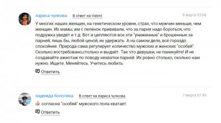 «Встречаюсь со вольным мужчиной, который сожительствует с иной дамой, – расскала создатель данной темы, – Он произнес, что волен, она мне названивает: верни супруга. Вопрос: для чего же она себя так унижает?» Этот вопросец оказался внезапно актуальным: почему почти все дамы готовы на все, лишь бы не утратить мужчину. Одни считают, во всем виновата статистика(на 10 девчонок – девять ребят), иные считают, что дело не в количестве парней, а в «низком качестве» возможных мужей, так что приходиться драться за каждый «приличный экземпляр». Просмотреть дискуссию можнож здесь.