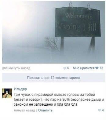 Вейпинг это как ислам. ты такой поясняешь «мы норм пасаны стараемся никому не мешать» и тут выбегает какое-то бородатое чмо и бац всё в дыму