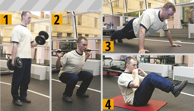 Комбинированное упражнение на пресс. Лежа на полу, одновременно приподнимаем ноги и корпус навстречу друг другу. 3—4 подхода с максимальным количеством повторов.