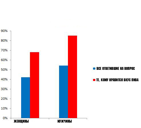 На диаграмме показан процент тех, кто ответил «Да» на вопрос «Готовы ли вы заняться сексом на первом свидании?». Как видишь, если девушке нравится вкус пива, вероятность секса с ней в первый же вечер знакомства увеличивается почти до 70%.