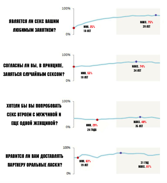 На таблицах отмечен процент женщин, ответивших «Да». Обрати внимание на возраст, в котором положительные ответы звучат чаще.
