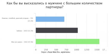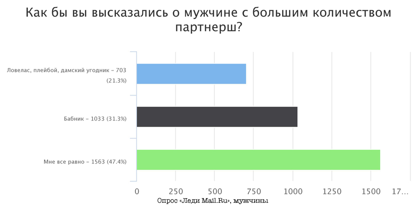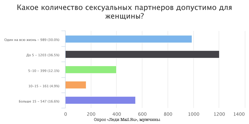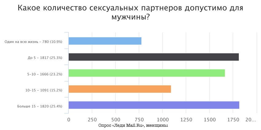 Итак, оказалось, что социально приемлемое количество партнеров по сексу для мужчин — понятие довольно широкое. Женщины считают, что вполне нормально, когда у представителя противоположного пола был 1 партнер и когда больше 15. Сами мужчины оставляют за собой право иметь столько партнерш, сколько захочется.