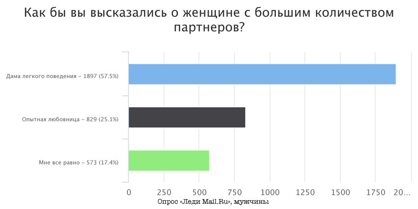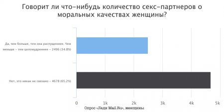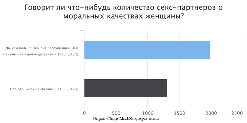 Напрашивается вывод, что по-прежнему в нашем обществе женщине предписывается быть скромной и целомудренной. И тем не менее на вопрос, говорит ли количество секс-пертнеров что-либо о моральных качествах человека, читатели в основном отвечают, что нет.