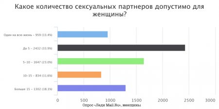Что касается интимной жизни женщин, то здесь мнения расходятся. Сами женщины в основном высказываются, что приемлемо иметь не больше пяти любовников. А вот мужчины гораздо больше голосуют за то, чтобы у нее был один-единственный мужчина на всю жизнь: 30% голосов против 13,4%.