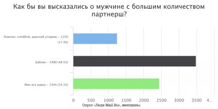 Мы спросили наших читателей, сколько, по их мнению, должно быть сексуальных партнеров у человека, и отличается ли это количество у мужчин и женщин.Тема оказалась на редкость животрепещущей: всего за пару дней в опросе приняли участие 10 470 человек. Итак, оказалось, что социально приемлемое количество партнеров по сексу для мужчин — понятие довольно широкое. Женщины считают, что вполне нормально, когда у представителя противоположного пола был 1 партнер и когда больше 15. Сами мужчины оставляют за собой право иметь столько партнерш, сколько захочется. Сравни слайды, двигая курсор вправо-влево. Что касается интимной жизни женщин, то здесь мнения расходятся. Сами женщины в основном высказываются, что приемлемо иметь не больше пяти любовников. А вот мужчины гораздо больше голосуют за то, чтобы у нее был один-единственный мужчина на всю жизнь: 30% голосов против 13,4%. О мужчине, в постели которого побывало много женщин, сами мужчины предпочитают не высказываться никак. А вот почти половина опрошенных женщин назвали бы его скорее «бабником», чем «ловеласом». Женщину, пользующуюся успехом у мужчин, представители обоих полов скорее назовут «дамой легкого поведения». Напрашивается вывод, что по-прежнему в нашем обществе женщине предписывается быть скромной и целомудренной. И тем не менее на вопрос, говорит ли количество секс-пертнеров что-либо о моральных качествах человека, читатели в основном отвечают, что нет. Довольно странное противоречие, учитывая, как еще в предыдущем вопросе те же самые респонденты весьма охотно развешивали ярлыки. Интересно, что мужчины, больше чем женщины, хотели бы быть в курсе количества предыдущих связей своей партнерши. Женщин этот вопрос интересует куда меньше. Кстати, больше трети мужчин разорвали бы отношения, узнав, что у их партнерши было слишком много (по их мнению) любовников. Женщины в этом вопросе не так категоричны: две трети респонденток не стали бы так поступать.