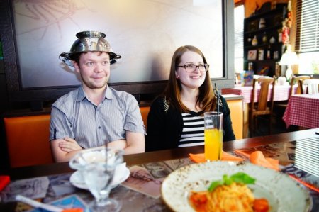 "Мне нравится эта религия из-за собственных принципов, ненавязчивости и юмора", — разговаривает Анатолий. Алина с ним согласна: "Макаронная вера различается лояльностью, положительным настроем".